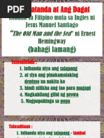 Mga Simbolismo ANG MATANDA AT ANG DAGAT dagat marlin TAGPUAN mga pating Sa isang Cuban na nayon sa dagat Mga Tauhan Ang MatandaSantiago -isang matandang mangingisda na nakahuli sa malaking Marlin. Ang Matanda at Ang Dagat Isinalin sa Filipino mula sa Ingles ni Jesus Manuel Santiago halaw mula sa nobelang The Old Man and The Sea ni Ernest Hemingway B. Ang mga oil spill na lumalabas sa mga barkong naaksidente sa dagat.