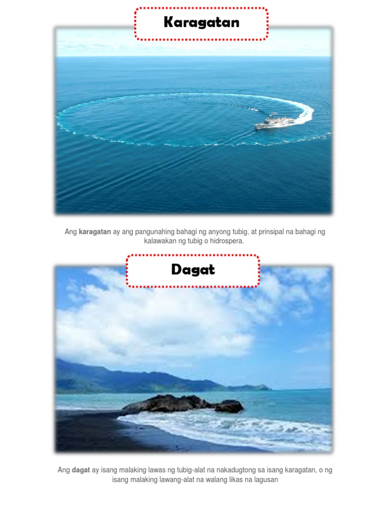 Dagat- malawak na anyong tubig na mas maliit sa karagatanMaalat ang tubig sapagkat nakadugtong ito sa karagatanKaragatan-ito ang pinakamalawak at pinakamalalim na anyong tubigMaalat ang tubig ditoGolpo-isang bahagi ng karagatan na makikita sa. Karagatan Ocean This is the widest. Ang anyong tubig na matatagpuan sa hilaga ng Pilipinas.
