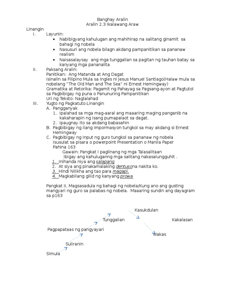 Ang Aralin 23 ay naglalaman ng isa sa obra maestrang nobela ni Ernest Hemingway na pinamagatang The Old Man and the Sea Ang Matanda at ang Dagat. Sa karagatan na mayroong cumulus clouds at cirus clouds. B Tauhan Santiago Ang bida sa nobela.